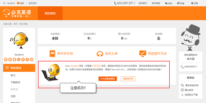 第二步:提交后简单下方页面即注册成功了!翻翻新学员手册,等待客服老师联系吧。
